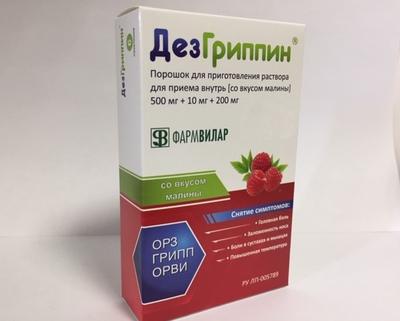 Артикул: 462273Полное название:Дезгриппин пор. д/р-ра д/приема внутрь 500 мг+10 мг+200 мг 5 г №6 малина, фармвилар нпо ооо