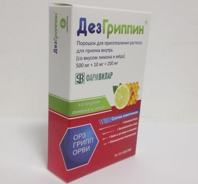 Артикул: 462277Полное название:Дезгриппин пор. д/р-ра д/приема внутрь 500 мг+10 мг+200 мг 5 г №6 мед и лимон, фармвилар нпо ооо