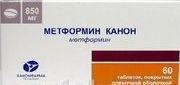 Артикул: 161202Полное название:Метформин Канон табл. п/о пленочной 850 мг №60, Канонфарма продакшн ЗАО / ФармВИЛАР НПО ООО / Радуга Продакшн ЗАО