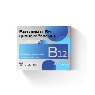 Артикул: 433291Полное название:Витамин В12 Витамир табл. 7-9 мкг /100 мг №30 БАД к пище цианокобаламин, Квадрат-С ООО