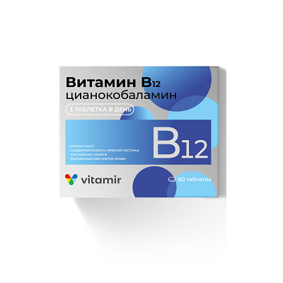 Артикул: 555417Полное название:Витамин В12 Витамир табл. 7-9 мкг / 100 мг №60 БАД к пище цианокобаламин, Квадрат-С ООО